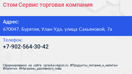 Стом-Сервис, торговая компания по адресу 670047, Бурятия, Улан-Удэ, улица Сахьяновой, 7а в дальнейшем Организация, размещена в следующих категориях: