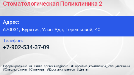 Стоматологическая Поликлиникa №2 по адресу 670031, Бурятия, Улан-Удэ, Терешковой, 40 в дальнейшем Организация, размещена в следующих категориях: