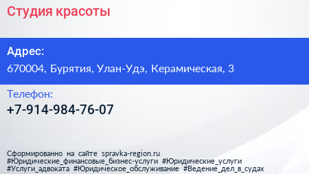 Студия красоты по адресу 670004, Бурятия, Улан-Удэ, Керамическая, 3 в дальнейшем Организация, размещена в следующих категориях: