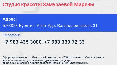 Студия красоты Замураевой Марины по адресу 670000, Бурятия, Улан-Удэ, Каландаришвили, 31 в дальнейшем Организация, размещена в следующих категориях:
