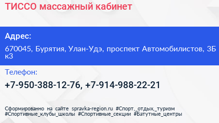 ТИССО, массажный кабинет по адресу 670045, Бурятия, Улан-Удэ, проспект Автомобилистов, 3Б к3 в дальнейшем Организация, размещена в следующих категориях: