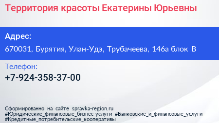 Территория красоты Екатерины Юрьевны по адресу 670031, Бурятия, Улан-Удэ, Трубачеева, 146а блок В в дальнейшем Организация, размещена в следующих категориях: