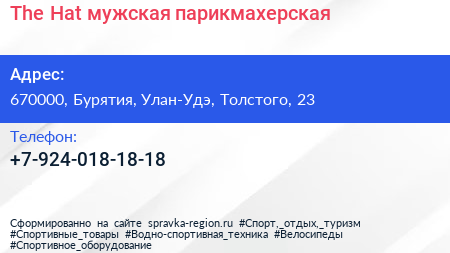 The Hat, мужская парикмахерская по адресу 670000, Бурятия, Улан-Удэ, Толстого, 23 в дальнейшем Организация, размещена в следующих категориях: