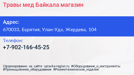Травы-мед Байкала, магазин по адресу 670033, Бурятия, Улан-Удэ, Жердева, 104 в дальнейшем Организация, размещена в следующих категориях: