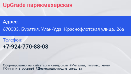 UpGrade, парикмахерская по адресу 670033, Бурятия, Улан-Удэ, Краснофлотская улица, 26а в дальнейшем Организация, размещена в следующих категориях: