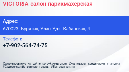 VICTORIA, салон-парикмахерская по адресу 670023, Бурятия, Улан-Удэ, Кабанская, 4 в дальнейшем Организация, размещена в следующих категориях:
