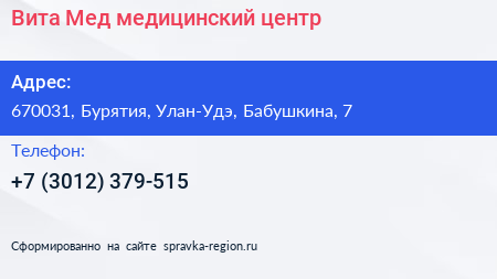 Вита-Мед, медицинский центр по адресу 670031, Бурятия, Улан-Удэ, Бабушкина, 7 в дальнейшем Организация, размещена в следующих категориях: