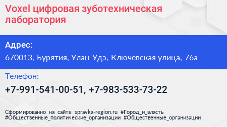 Voxel, цифровая зуботехническая лаборатория по адресу 670013, Бурятия, Улан-Удэ, Ключевская улица, 76а в дальнейшем Организация, размещена в следующих категориях: