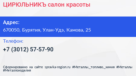 ЦИРЮЛЬНИКЪ, салон красоты по адресу 670050, Бурятия, Улан-Удэ, Камова, 25 в дальнейшем Организация, размещена в следующих категориях: