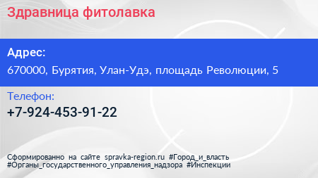 Здравница, фитолавка по адресу 670000, Бурятия, Улан-Удэ, площадь Революции, 5 в дальнейшем Организация, размещена в следующих категориях: