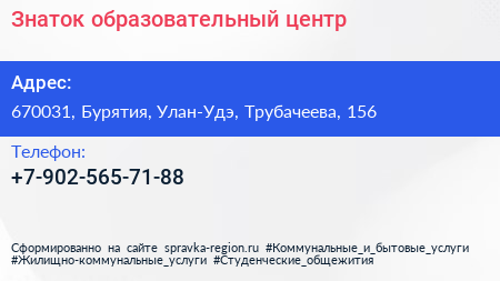 Знаток, образовательный центр по адресу 670031, Бурятия, Улан-Удэ, Трубачеева, 156 в дальнейшем Организация, размещена в следующих категориях: