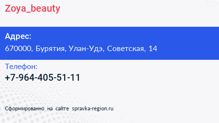 Zoya_beauty по адресу 670000, Бурятия, Улан-Удэ, Советская, 14 в дальнейшем Организация, размещена в следующих категориях: