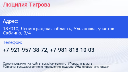 Люцилия Тигрова по адресу 187010, Ленинградская область, Ульяновка, участок Саблино, 3/4 в дальнейшем Организация, размещена в следующих категориях:
