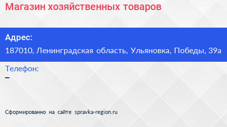 Магазин хозяйственных товаров по адресу 187010, Ленинградская область, Ульяновка, Победы, 39а в дальнейшем Организация, размещена в следующих категориях: