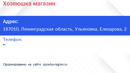 Хозяюшка, магазин по адресу 187010, Ленинградская область, Ульяновка, Елизарова, 2 в дальнейшем Организация, размещена в следующих категориях: