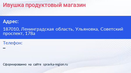 Ивушка, продуктовый магазин по адресу 187010, Ленинградская область, Ульяновка, Советский проспект, 178а в дальнейшем Организация, размещена в следующих категориях: