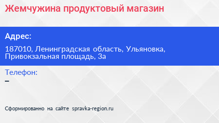 Жемчужина, продуктовый магазин по адресу 187010, Ленинградская область, Ульяновка, Привокзальная площадь, 3а в дальнейшем Организация, размещена в следующих категориях: