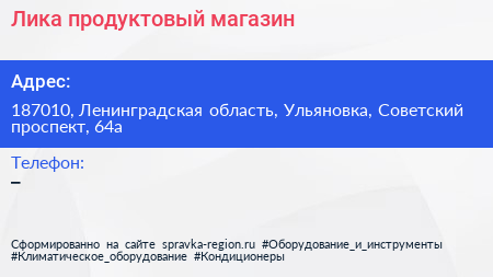 Лика, продуктовый магазин по адресу 187010, Ленинградская область, Ульяновка, Советский проспект, 64а в дальнейшем Организация, размещена в следующих категориях: