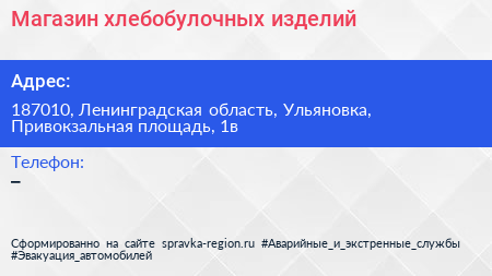 Магазин хлебобулочных изделий по адресу 187010, Ленинградская область, Ульяновка, Привокзальная площадь, 1в в дальнейшем Организация, размещена в следующих категориях: