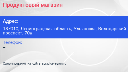 Продуктовый магазин по адресу 187010, Ленинградская область, Ульяновка, Володарский проспект, 70а в дальнейшем Организация, размещена в следующих категориях: