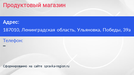 Продуктовый магазин по адресу 187010, Ленинградская область, Ульяновка, Победы, 39а в дальнейшем Организация, размещена в следующих категориях: