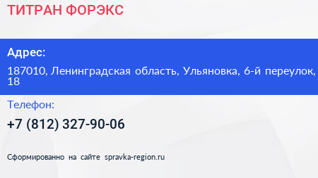 ТИТРАН-ФОРЭКС по адресу 187010, Ленинградская область, Ульяновка, 6-й переулок, 18 в дальнейшем Организация, размещена в следующих категориях: