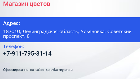 Магазин цветов по адресу 187010, Ленинградская область, Ульяновка, Советский проспект, 8 в дальнейшем Организация, размещена в следующих категориях: