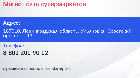 Магнит, сеть супермаркетов по адресу 187010, Ленинградская область, Ульяновка, Советский проспект, 13 в дальнейшем Организация, размещена в следующих категориях: