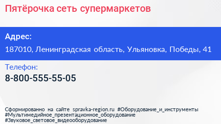 Пятёрочка, сеть супермаркетов по адресу 187010, Ленинградская область, Ульяновка, Победы, 41 в дальнейшем Организация, размещена в следующих категориях: