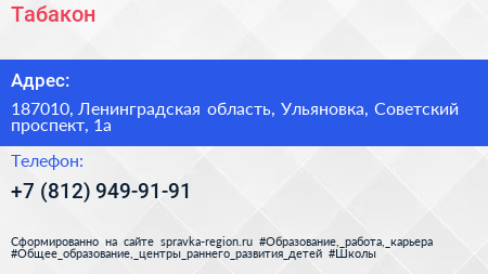 Табакон по адресу 187010, Ленинградская область, Ульяновка, Советский проспект, 1а в дальнейшем Организация, размещена в следующих категориях: