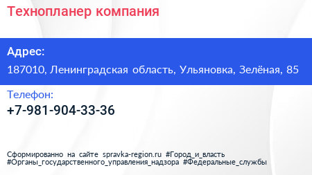 Технопланер, компания по адресу 187010, Ленинградская область, Ульяновка, Зелёная, 85 в дальнейшем Организация, размещена в следующих категориях: