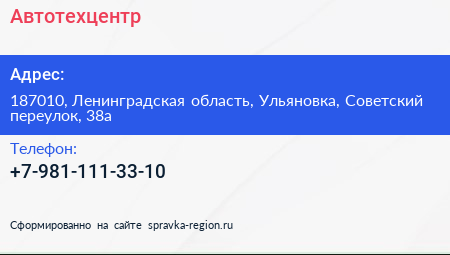 Автотехцентр по адресу 187010, Ленинградская область, Ульяновка, Советский переулок, 38а в дальнейшем Организация, размещена в следующих категориях:
