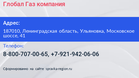 Глобал Газ, компания по адресу 187010, Ленинградская область, Ульяновка, Московское шоссе, 41 в дальнейшем Организация, размещена в следующих категориях: