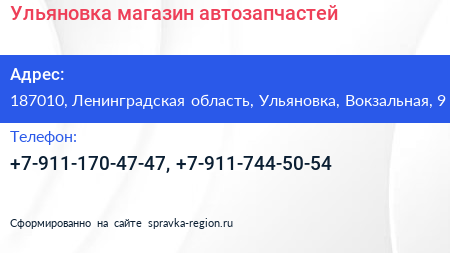 Ульяновка, магазин автозапчастей по адресу 187010, Ленинградская область, Ульяновка, Вокзальная, 9 в дальнейшем Организация, размещена в следующих категориях: