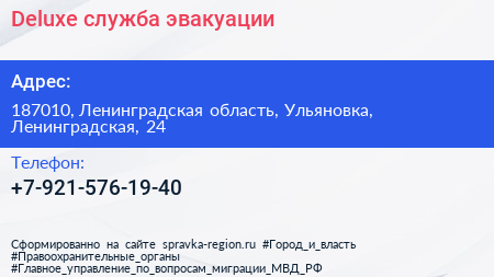 Deluxe, служба эвакуации по адресу 187010, Ленинградская область, Ульяновка, Ленинградская, 24 в дальнейшем Организация, размещена в следующих категориях:
