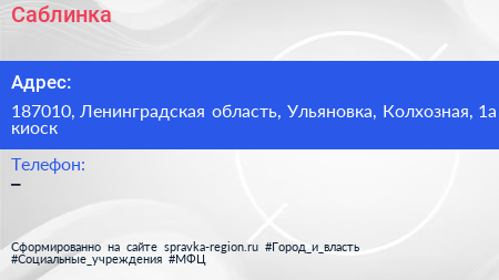 Саблинка по адресу 187010, Ленинградская область, Ульяновка, Колхозная, 1а киоск в дальнейшем Организация, размещена в следующих категориях: