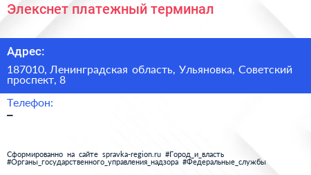 Элекснет, платежный терминал по адресу 187010, Ленинградская область, Ульяновка, Советский проспект, 8 в дальнейшем Организация, размещена в следующих категориях: