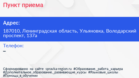 Пункт приема по адресу 187010, Ленинградская область, Ульяновка, Володарский проспект, 137а в дальнейшем Организация, размещена в следующих категориях: