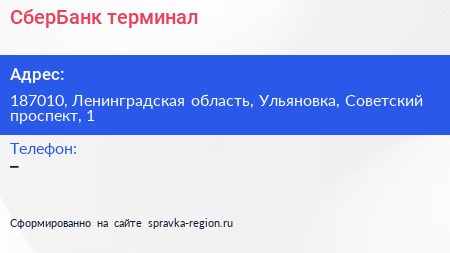 СберБанк, терминал по адресу 187010, Ленинградская область, Ульяновка, Советский проспект, 1 в дальнейшем Организация, размещена в следующих категориях: