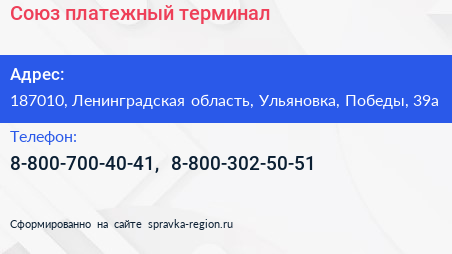 Союз, платежный терминал по адресу 187010, Ленинградская область, Ульяновка, Победы, 39а в дальнейшем Организация, размещена в следующих категориях: