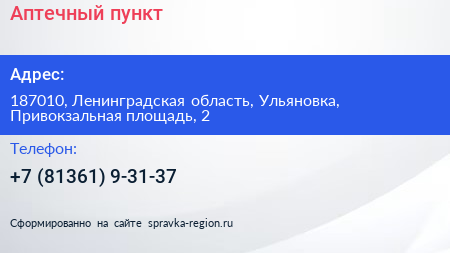 Аптечный пункт по адресу 187010, Ленинградская область, Ульяновка, Привокзальная площадь, 2 в дальнейшем Организация, размещена в следующих категориях: