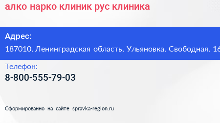 алко-нарко-клиник.рус, клиника по адресу 187010, Ленинградская область, Ульяновка, Свободная, 16 в дальнейшем Организация, размещена в следующих категориях: