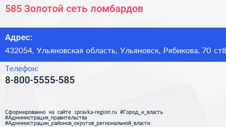 585*Золотой, сеть ломбардов по адресу 432054, Ульяновская область, Ульяновск, Рябикова, 70 ст8 в дальнейшем Организация, размещена в следующих категориях: