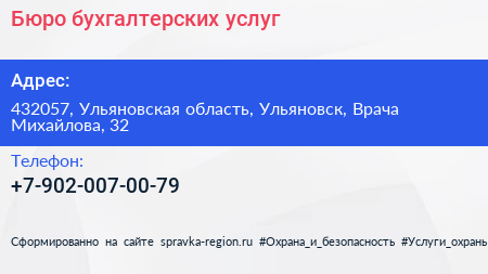 Бюро бухгалтерских услуг по адресу 432057, Ульяновская область, Ульяновск, Врача Михайлова, 32 в дальнейшем Организация, размещена в следующих категориях: