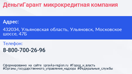ДеньгиГарант, микрокредитная компания по адресу 432034, Ульяновская область, Ульяновск, Московское шоссе, 47Б в дальнейшем Организация, размещена в следующих категориях: