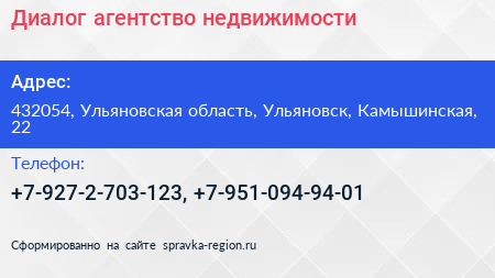 Диалог, агентство недвижимости по адресу 432054, Ульяновская область, Ульяновск, Камышинская, 22 в дальнейшем Организация, размещена в следующих категориях: