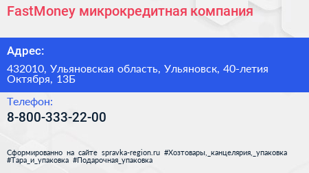 FastMoney, микрокредитная компания по адресу 432010, Ульяновская область, Ульяновск, 40-летия Октября, 13Б в дальнейшем Организация, размещена в следующих категориях: