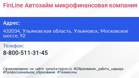 FinLine-Автозайм, микрофинансовая компания по адресу 432034, Ульяновская область, Ульяновск, Московское шоссе, 92 в дальнейшем Организация, размещена в следующих категориях: