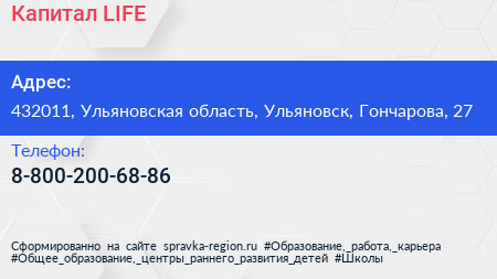 Капитал LIFE по адресу 432011, Ульяновская область, Ульяновск, Гончарова, 27 в дальнейшем Организация, размещена в следующих категориях:
