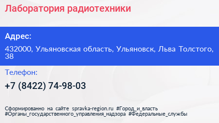Лаборатория радиотехники по адресу 432000, Ульяновская область, Ульяновск, Льва Толстого, 38 в дальнейшем Организация, размещена в следующих категориях: